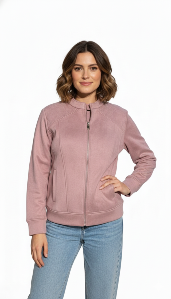 This is a stylish winter jacket in a soft pink color with a full front zip and a clean, fitted design. It is made from warm and comfortable fabric, making it suitable for winter wear. The jacket offers a smart and elegant look, perfect for daily use, casual outings, or light outdoor activities in cold weather.