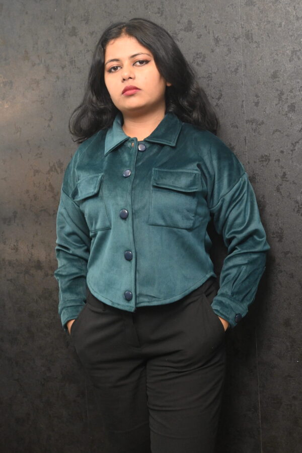 This is a stylish winter shacket set in a deep green shade, designed to give both warmth and a trendy look. It features a corduroy shacket with a button-down front, collar, and front pockets, paired with matching bottoms for a coordinated style. The soft and warm fabric makes it ideal for winter wear, perfect for casual outings, daily wear, or smart winter layering.