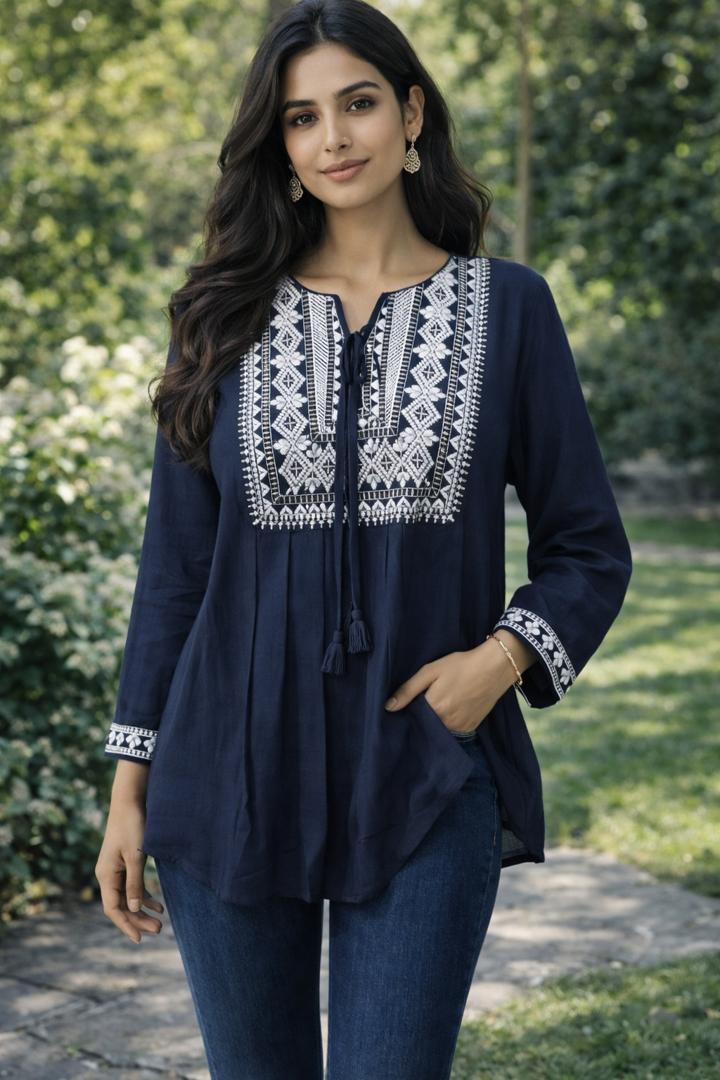 Be the first to review “Navy blue cotton embroidered top with ethnic pattern.” Cancel reply