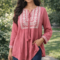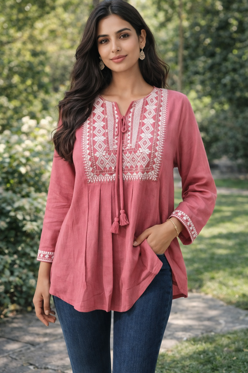 Be the first to review “Peach cotton embroidered top with tassel neck design.”
