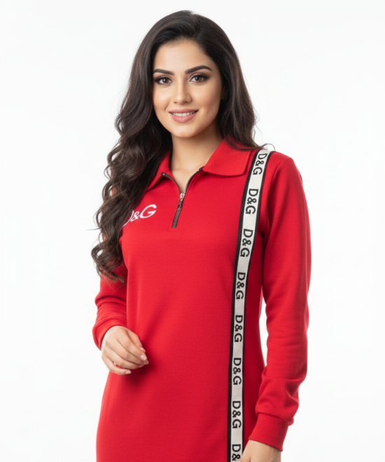 This is a stylish winter dress in a bold red color, designed with a straight and comfortable fit. It features full sleeves, a short zip collar, and a soft, warm fabric that makes it suitable for winter wear. The side tape detailing adds a modern touch, making this dress perfect for casual outings, daily wear, or relaxed winter styling.
