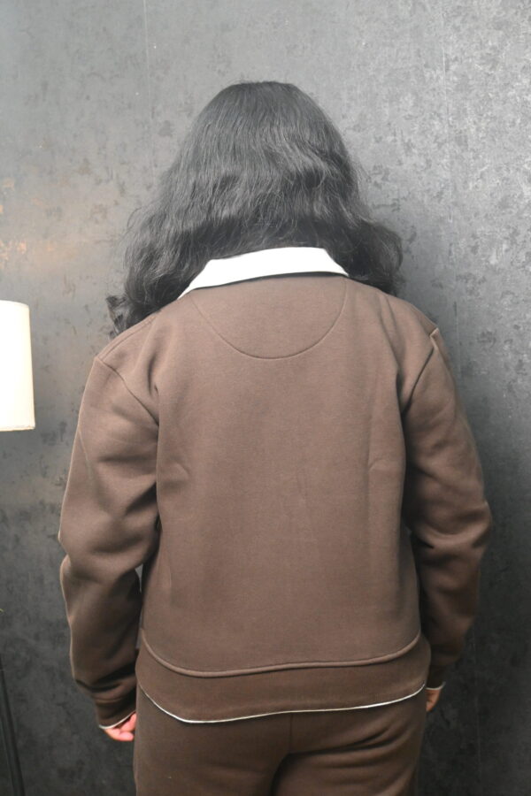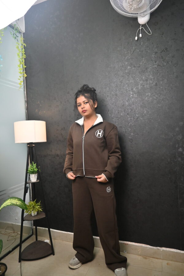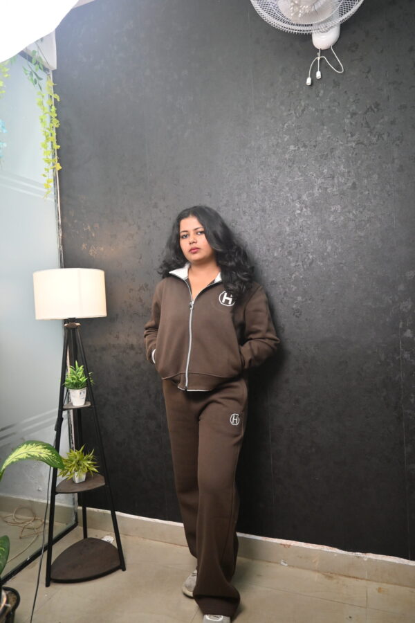 This is a warm winter cord set in a rich mocha brown color, designed for comfort and everyday style. It features a cropped zip-up jacket with a soft collar paired with matching relaxed-fit trousers, offering a cozy and flattering look. Made from warm and soft fabric, this cord set is perfect for winter wear, lounging, travel, or casual outings while maintaining a stylish and modern appearance.