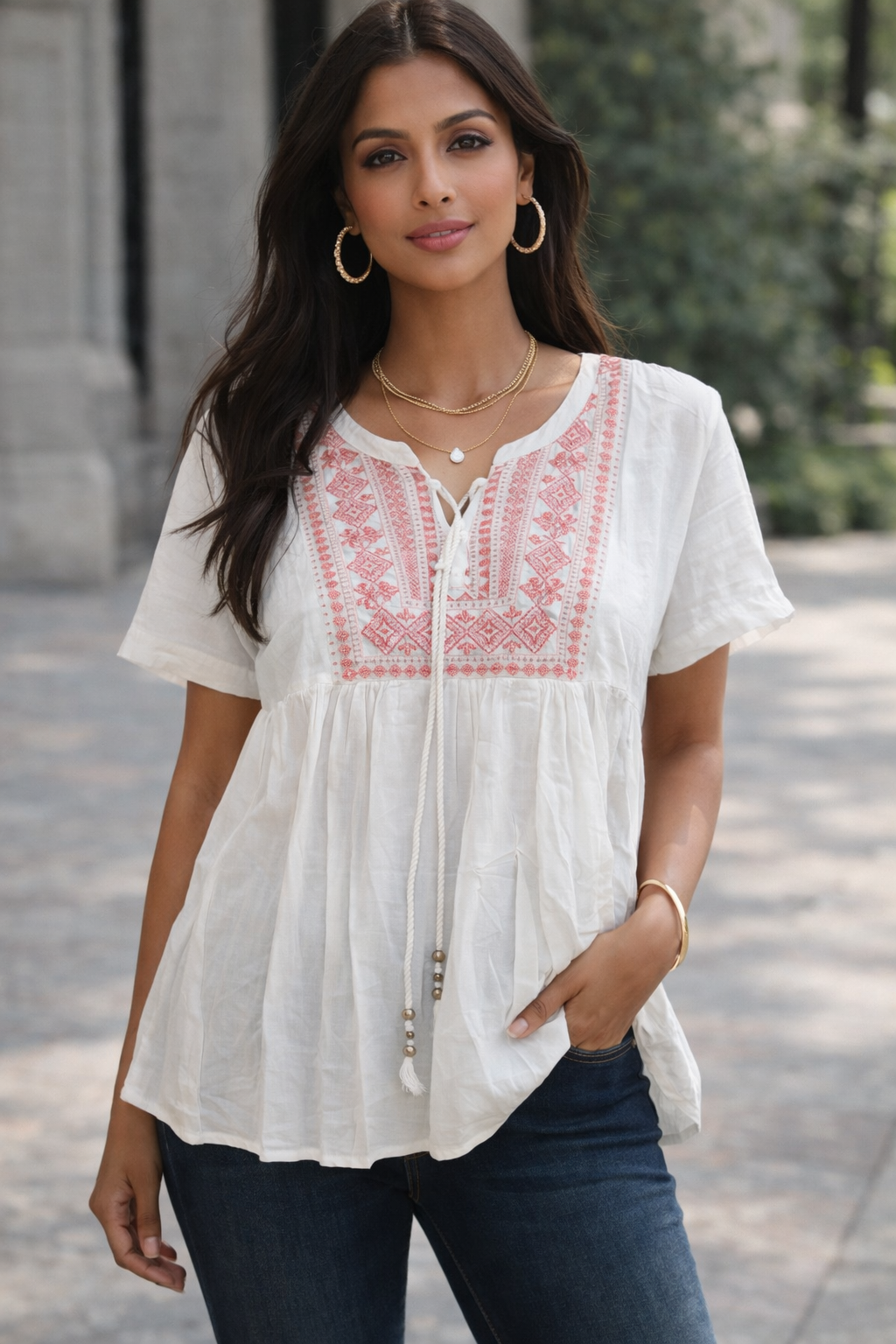 Be the first to review “Stylish white cotton top with pink embroidery, casual and comfortable wear.”