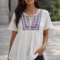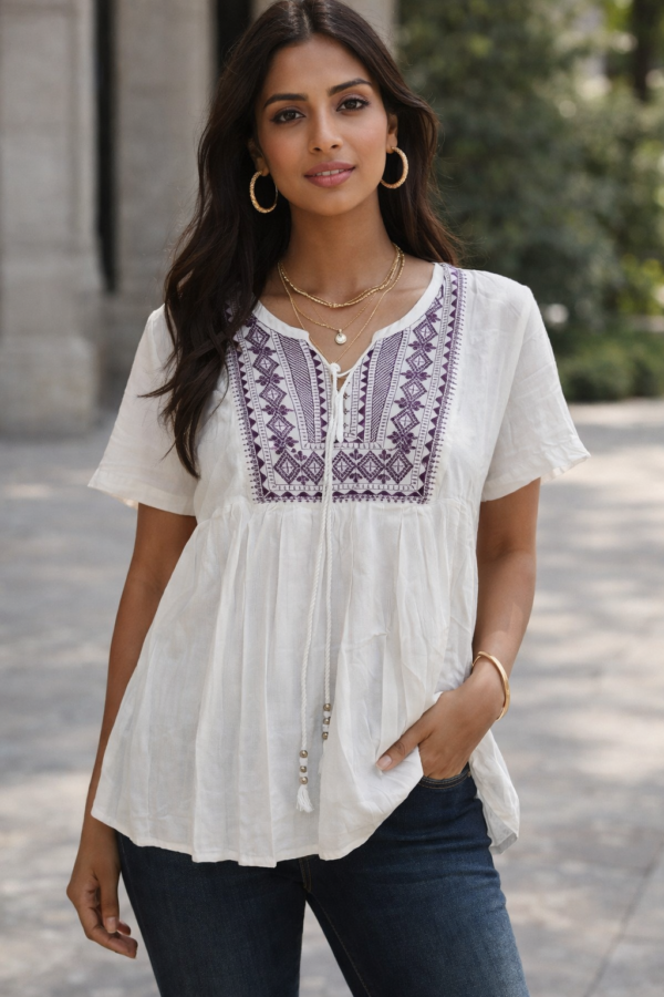 Stylish white cotton top with purple embroidery, casual and comfortable wear.
