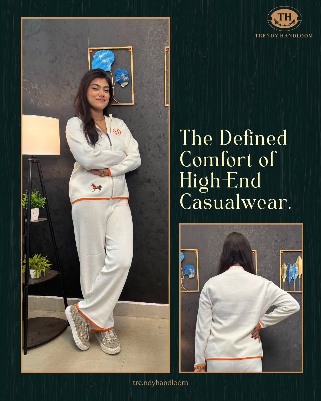 This is a stylish white winter cord set designed for comfort and everyday wear. It features a warm full-sleeve top with a front zip and matching relaxed-fit pants, highlighted with subtle contrast detailing. The soft and cozy fabric makes it ideal for winter, offering a clean, modern look that is perfect for casual outings, travel, or daily use.